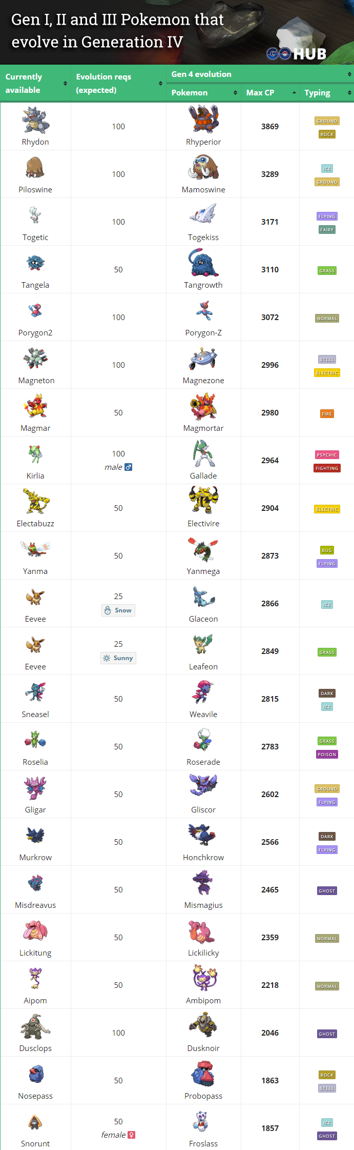 Om je te helpen met het voorbereiden, is hieronder een overzicht geplaatst met alle oudere Pokémon (groen weergegeven) met hun toekomstige evolutie. De exacte voorwaarden voor de evoluties moeten nog bekend worden gemaakt, maar eerste schattingen zijn gemaakt. De credits voor de afbeelding gaan volledig naar Pokemon GoHub.