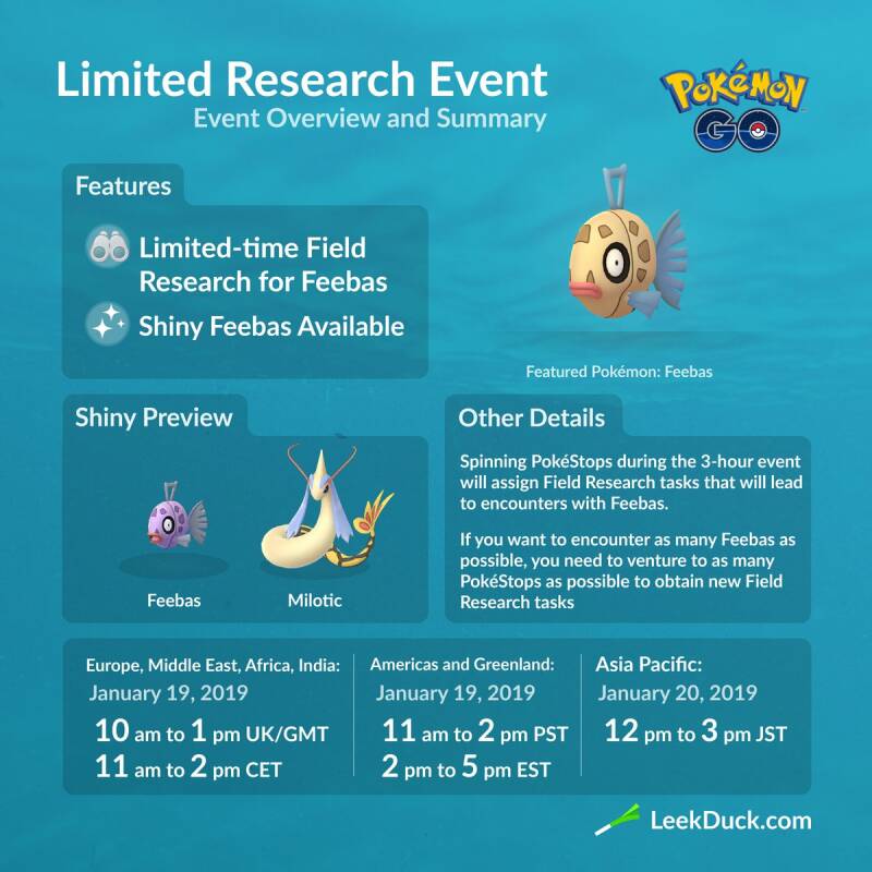 Niantic heeft de allereerste Special Research Day aangekondigd, die in het teken zal staan van Feebas. Dit event houdt in dat er voor een bepaalde tijd speciale Field Research opdrachten beschikbaar zullen zijn, die Feebas als reward geven. Feebas kan hierbij mogelijk shiny zijn. In Nederland vindt dit event 19 januari plaats van 11:00 tot 14:00. Verdere details zijn op dit moment nog niet bekend.